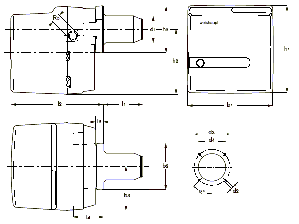 | 型号 | I1 | I2 | I3 | I4 | b1 | b2 | b3 | h1 | h2 | h3 | d1 | d2 | d3 | d4 | Rp | a° |