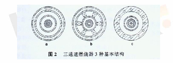 从上述分析中可知,增加一次射流的旋流数将提高一次射流的引射速率,即煤粉和二次风的混合速率,从而强化了窑头煤粉燃烧,使火焰变得粗短,所以旋流系数又被称之为火焰形状系数。实际上燃烧器喷嘴结构形式和参数的变化也明显地影响火焰的形状。从空气动力学的角度简单地理解,一次射流对二次风的引射量取决于一次射流的动量通量,其引射速率除受一次射流角动量通量控制外,一次射流和二次风的接触面积(以水力半径度量)显然对引射速率有较大影响,因为引射是通过射流股和周边二次风接触而上的动量交换而产生的。喷嘴设计中,在保持喷嘴出口截面积不变情况下减小水力半径,即增加射流股和二次风的接触面积,将增加煤粉和二次风的混合速率,使火焰变得粗短;另一方面也由于过高的二次风混入速率使一次射流股的核心速度衰减过快,表现为火焰“刚度”下降,对窑内的穿透深度减小。笔者曾就当时市面上的三通道煤粉燃烧器归纳成3种基本结构形式,见图2。其中在相同的一次净风总的出口截面积情况下,c型对二次风的引射速率高于a型,实践中前者火焰粗短,燃烧剧烈,较适合于强化煅烧情况。b型中煤粉通道被分割成数个流股,由于煤粉通道介于内风和外风通道之间,因而增加了煤粉对一次风的混合能力。笔者认为,这种结构形式可能对燃烧速率影响不大,实践中我国在300t/d、600t/d的预热器窑上使用较多,普遍认为火焰散,有时甚至出现所谓的“鹰爪型”火焰,这种不利现象可以通过适当减小煤粉通道的动量通量得以改善。