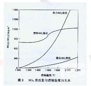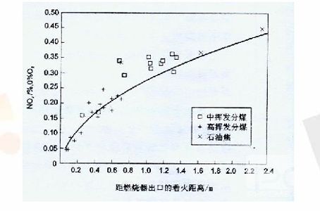 我国目前水泥回转窑的Nox排放量大都超过0.1%,高的超过0.2%,而一些先进国家已控制在0.02%-0.04%以下。燃烧过程中Nox排放分3种类型,即热力Nox排放、燃料Nox排放和催化Nox排放,三者与燃烧温度的关系见图3。由于窑头火焰温度高达1800℃左右,热力Nox占主要地位(当燃料中含有碳氢化合物时,会在较低温度下出现催化Nox排放)。减少窑头Nox排放的主要途径在于一方面应尽量降低火焰的峰值温度,避免局部高温,这往往和强化燃烧概念相矛盾,需要对火焰各阶段的二次风混合速率进行控制;另一方面应控制局部氧浓度,特别是对燃烧器出口至着火这一阶段的氧浓度控制。图4中高挥发分烟煤、中等挥发分烟煤和石油焦的着火温度依次升高。在相同受限射流火焰中,三者距燃烧器出口的着火距离依次是石油焦>中等挥发分烟煤>高挥发分烟煤,其Nox排放量大小依次是石油焦>中等挥发分烟煤>高挥发分烟煤。