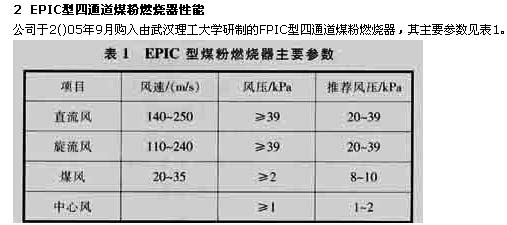 公司于2()05年9月购入由武汉理工大学研制的FPIC型四通道煤粉燃烧器,其主要参数见表1。